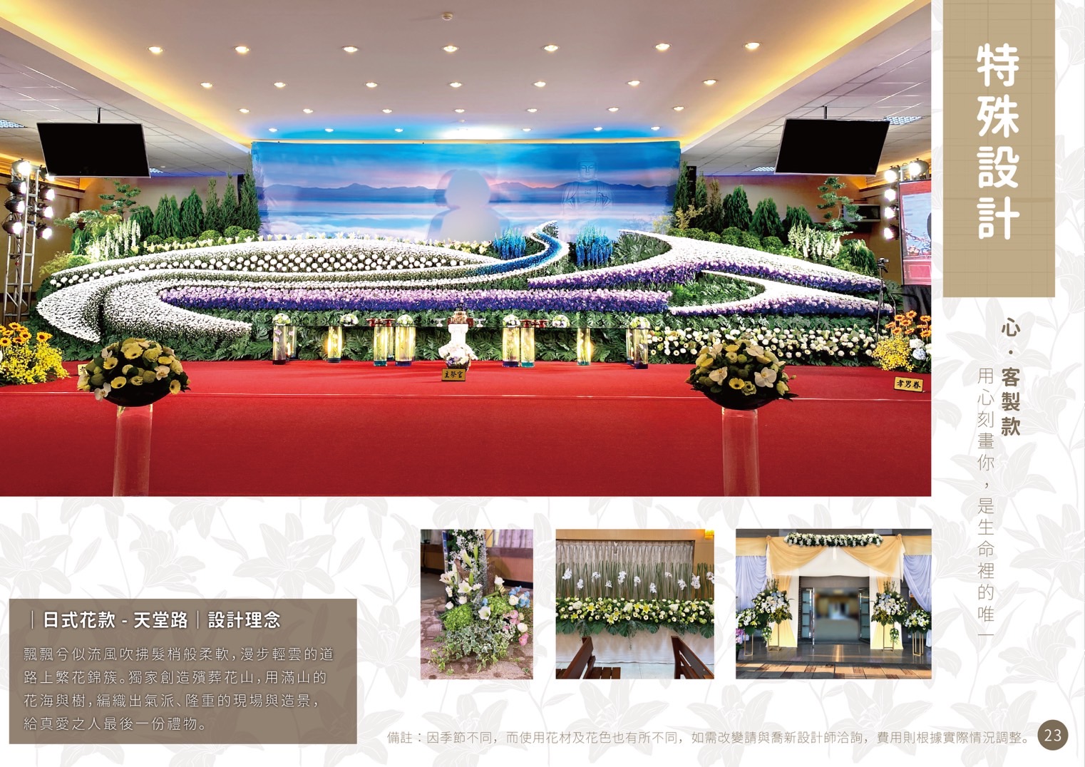 飄飄兮似流風吹拂髮梢般柔軟,漫步輕雲的道路上繁花錦筷。獨家創造殯葬花山, 用滿山的花海與樹,編織出氣派、隆重的現場與造景給真愛之人最後一份禮物。